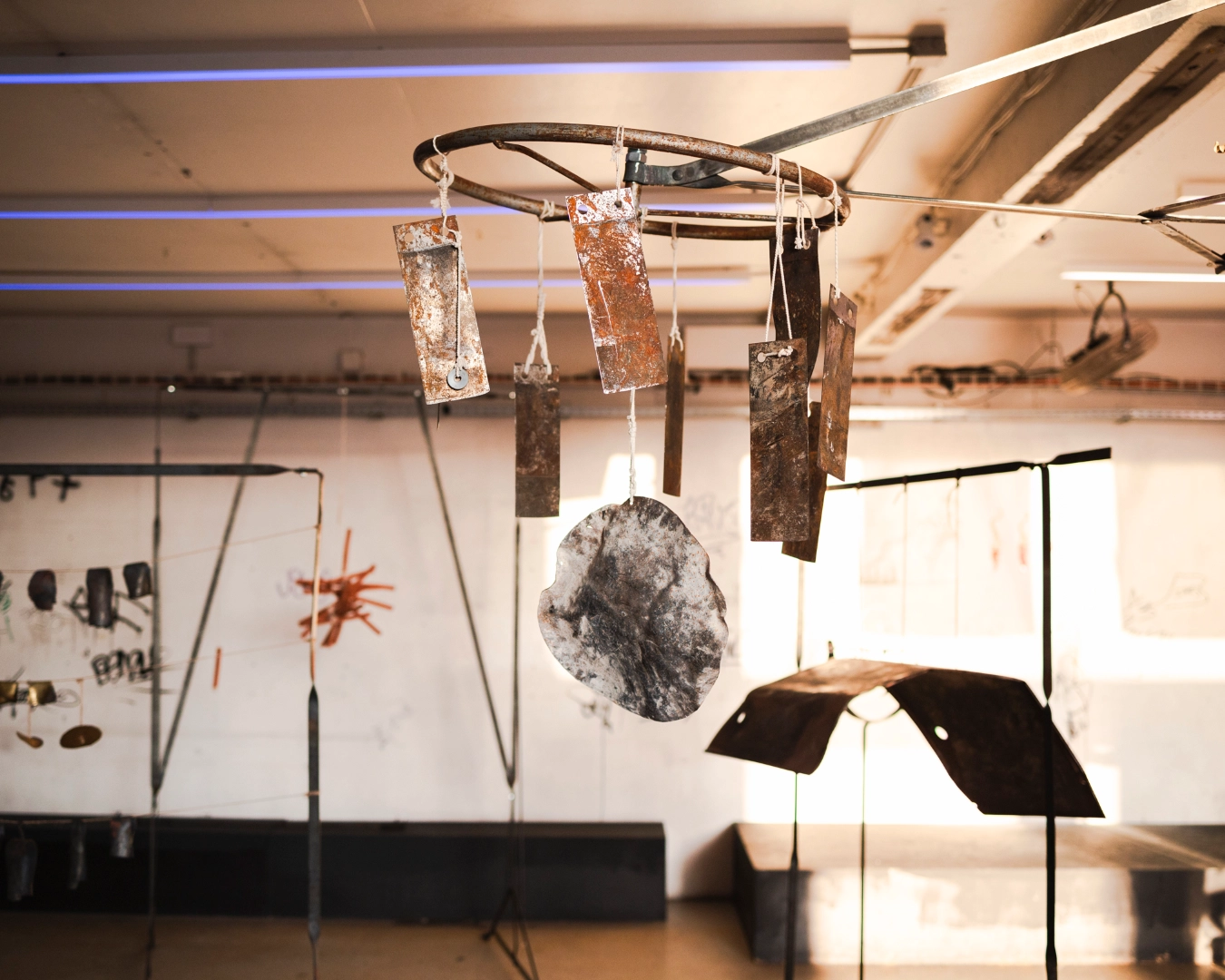 L’Instrumentarium & La forgeronne forment deux cycles d’ateliers autour d’un médium : le métal. Les artistes proposent à tour de rôle d'explorer les usages du métal à travers la construction d’outils (clous), d’idiophones (petits instruments à percussion, sonnailles) et d’éléments percussifs (marteaux, baguettes…), qui, une fois rassemblés forme une œuvre collective et sonore : à la fois sculpture et instrument géant.