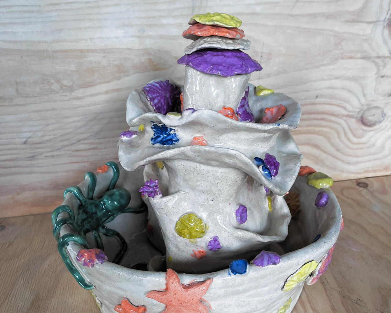 Durant l’été, nous avons invité les habitants à explorer les caractéristiques anatomiques étonnantes des animaux qui peuplent nos mers, nos océans et nos rivières. Opale Mirman et Pia-Mélissa Laroche ont transmis aux enfants et voisins de La Station les techniques pour traduire en céramique les textures visqueuses, les jeux de transparences, les couleurs brillantes des écailles et leurs reflets. Guidés par les artistes, les participants ont créé collectivement deux fontaines : la première a été installée dans le jardin partagé de la Cité Charles Hermite et la deuxième a trouvé sa place dans les espaces extérieurs de La Station.