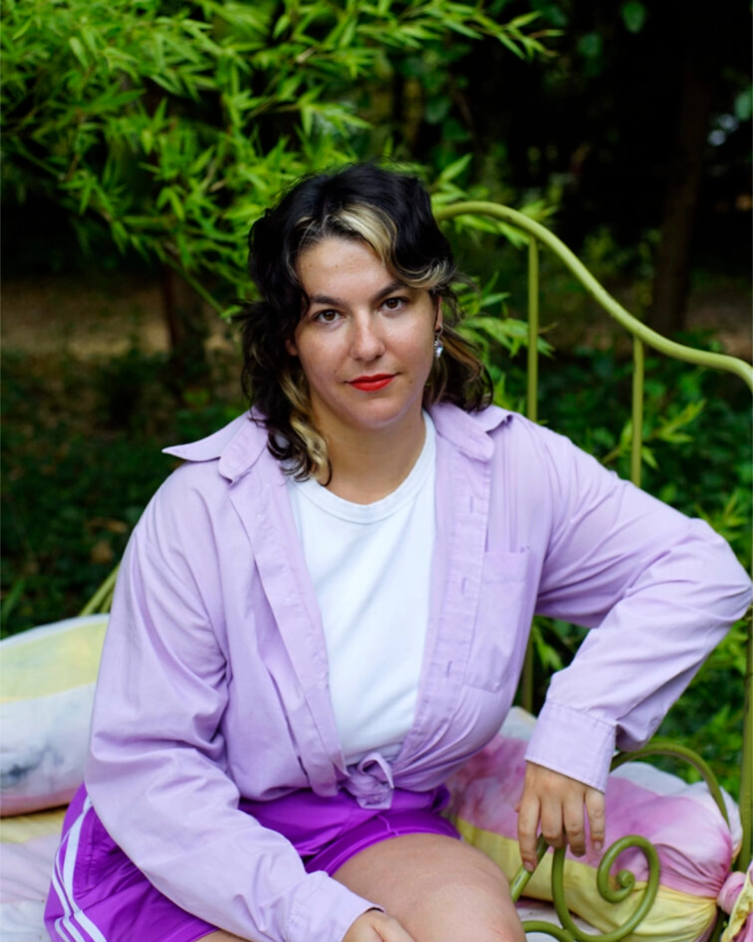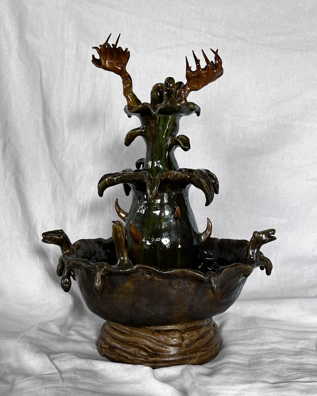 Sa pratique, qui mêle céramique, peinture et performance, s’inscrit dans cette exploration. Ses formes coulantes et crochues, ornées de motifs d’algues et de coquillages, donnent l’apparence d’artefacts émergés d’un monde aquatique imaginaire – une fausse archéologie où des récits oubliés trouvent leur place. Des êtres hybrides, souvent ancré·es dans des codes féminins, jouent sur le déguisement et la théâtralité, nourris par l’univers subversif du cabaret, du burlesque et du carnavalesque. En assumant une esthétique kitsch, elle interroge les normes de goût et les constructions sociales qui opposent le trivial au raffiné. Les couleurs saturées deviennent des outils déplaçant les hiérarchies esthétiques et sociales.