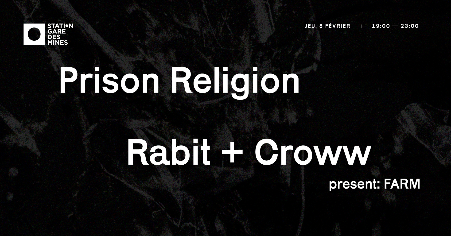 Un temps associé au renouveau grime anglais (Mumdance, Logos) et aux déconstructionnistes berlinois en vogue (Lotic, M.E.S.H….), Rabit a développé une signature sonore parfaitement alien se traduisant par de nombreux projets et collaborations, notamment avec Eartheater, Arca, Elysia Crampton ou Drew McDowall (Coil). Point culminant de cette histoire déjà riche, son duo avec Croww (mancunien dont la pratique agitée se situe à l'intersection entre le black metal et la dance hypermoderne et dont la première sortie a trouvé comme terre d'accueil le très conseillable label The Death Of Rave) fera sa première apparition mondiale (!) à La Station.