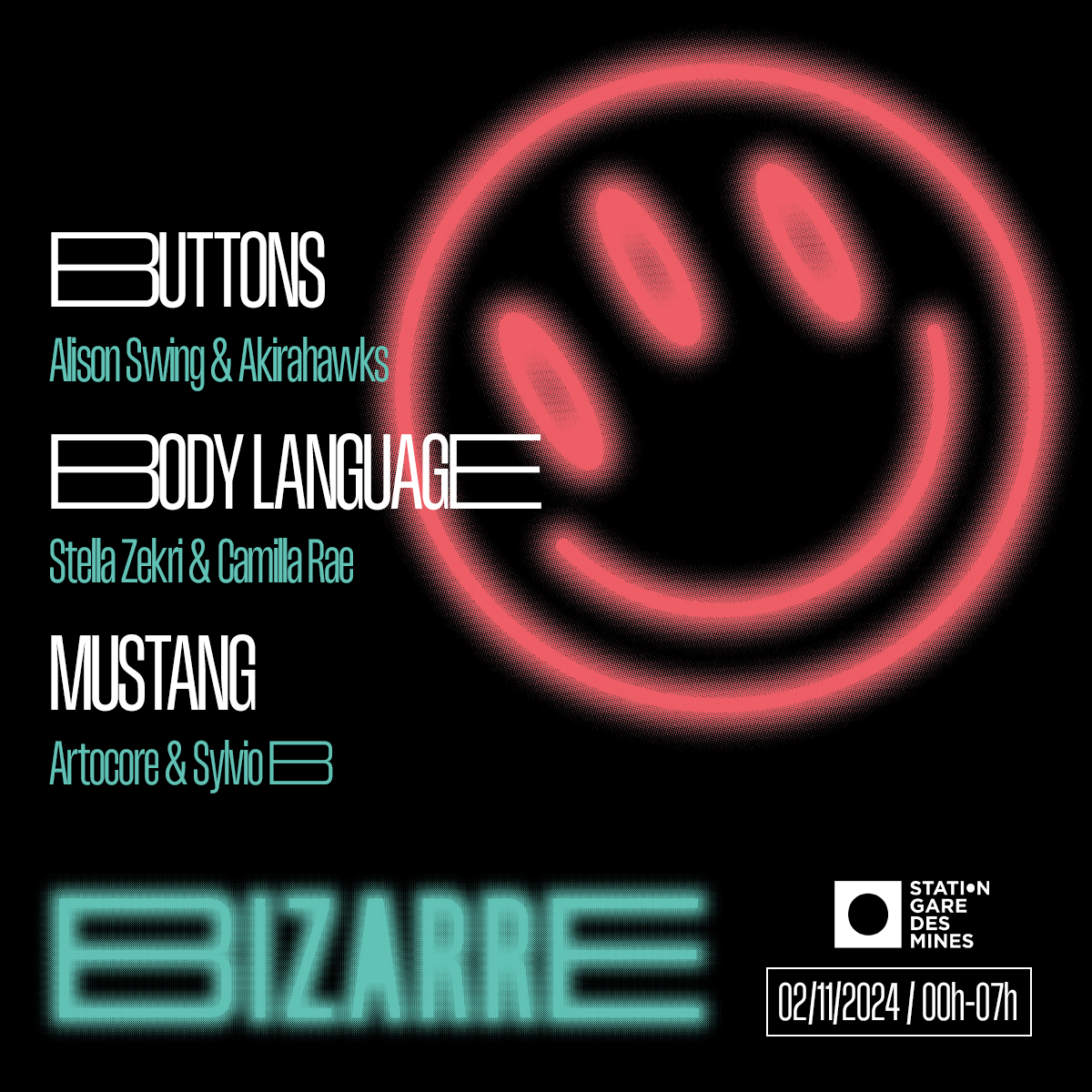 Le samedi 02 novembre, BIZARRE pose ses valises à la Station - Gare des Mines et rassemblera 3 énergies iconiques de la scène house européenne : le légendaire et réputé berlinois Buttons, le collectif féministe et label avant-gardiste également berlinois Body Language ainsi que Mustang, la soirée brûlante et gay-gay-gay ouverte à tous·tes