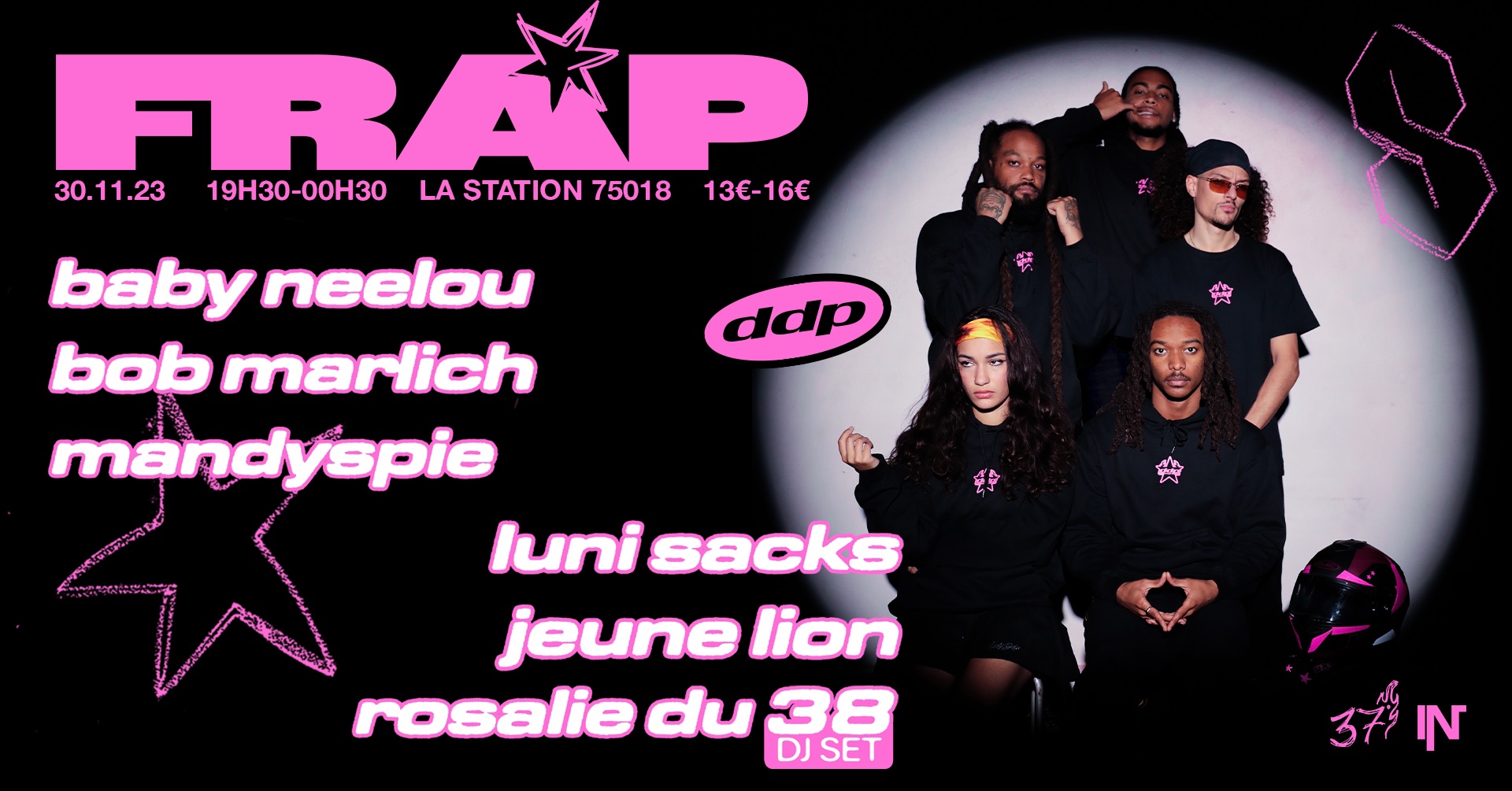 Pour cette quatrième édition, Trente Sept Degrés te donne rdv à La Station Gare des Mines le 30 novembre prochain de 19h30 à 00h30 pour turn up avec les pépites du rap émergent, et cop le merch exclusif FRAP, une collab Trente Sept Degrés x DDP (pop up store à l’intérieur de la salle)
