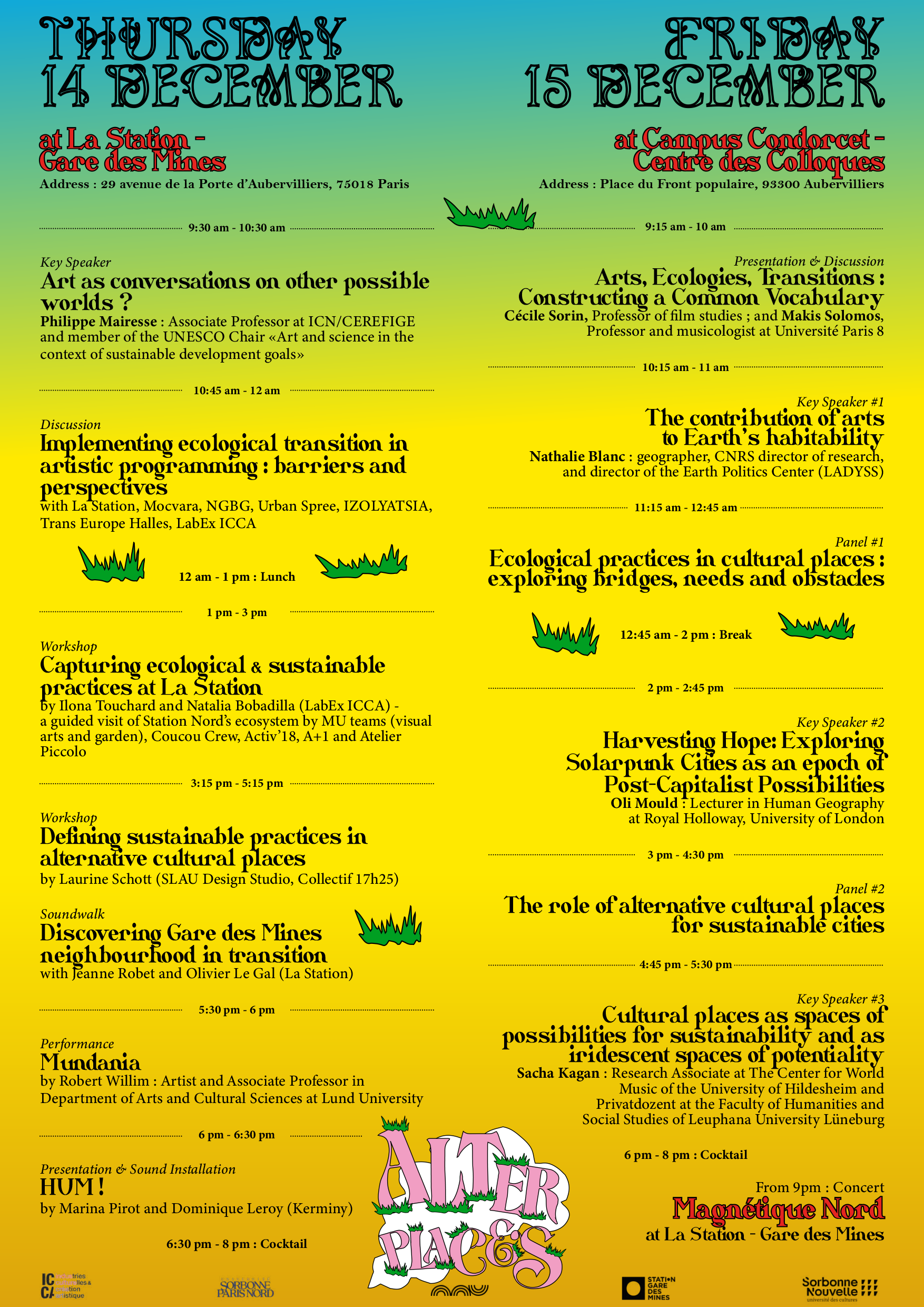 However, the practices developed, the value and knowledge produced remain embedded as tacit knowledge that need to be documented and transferred. ALTER-PLACES symposium has the ambition to explore the innovative sustainable practices developed by ACPs and evaluate their role in urban resilience and that of the cultural and artistic sector.