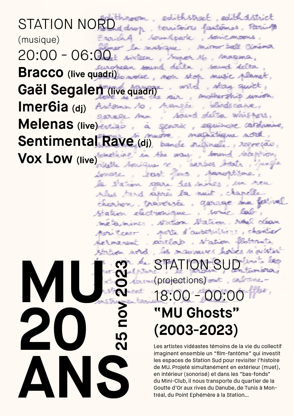 Les artistes vidéastes témoins de la vie du collectif imaginent ensemble un “film-fantôme” qui investit les espaces de Station Sud pour revisiter l’histoire de MU. Projeté simultanément en extérieur (muet), en intérieur (sonorisé) et dans les “bas-fonds” du Mini-Club, il nous transporte du quartier de la Goutte d’Or aux rives du Danube, de Tunis à Montréal, du Point Ephémère à la Station…