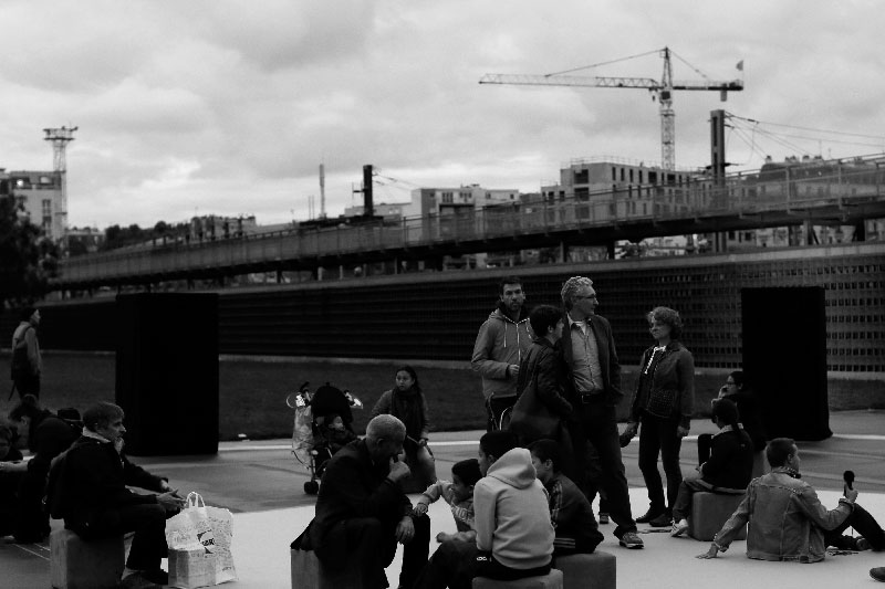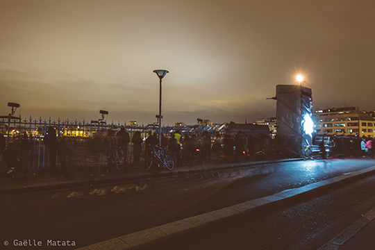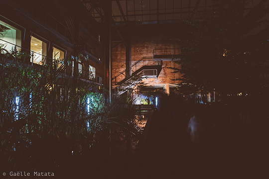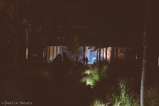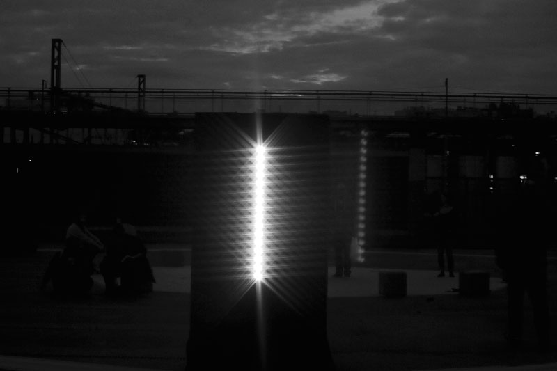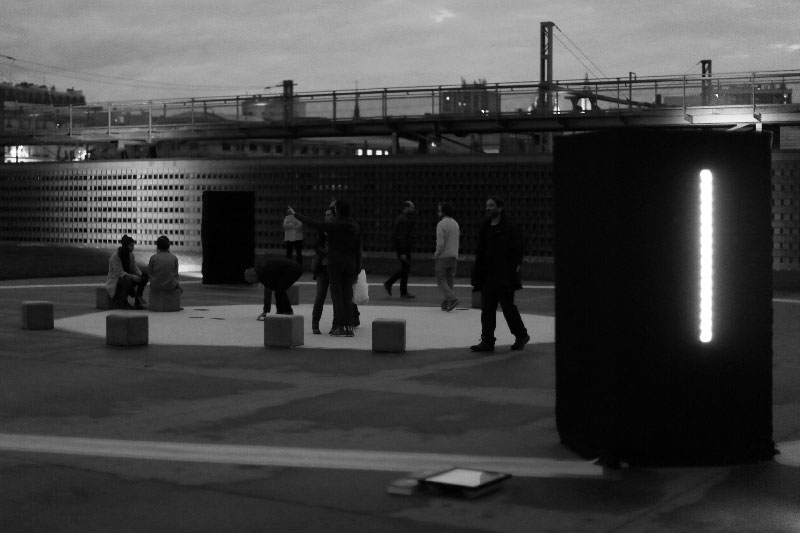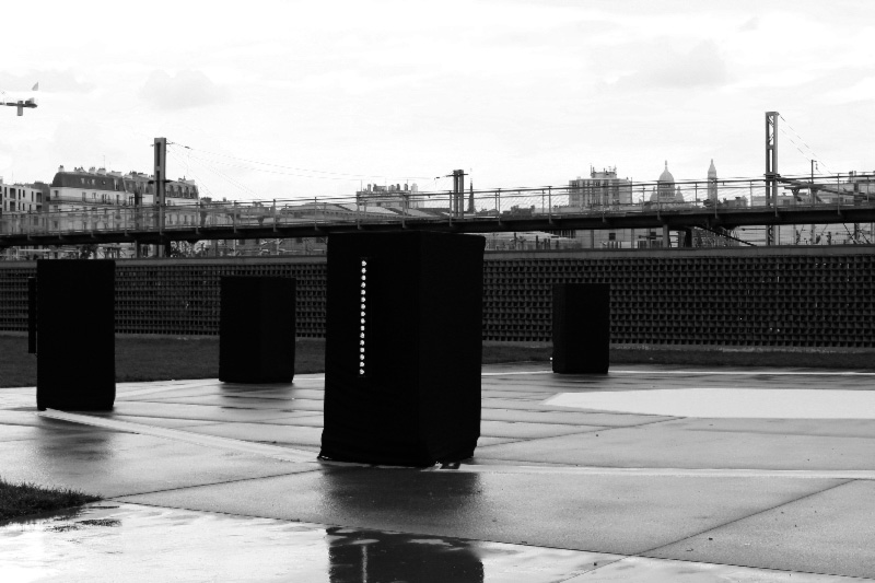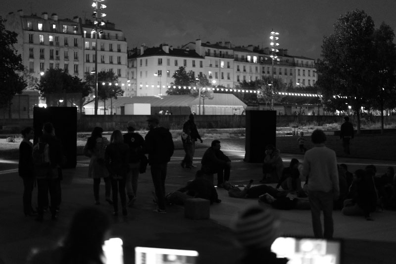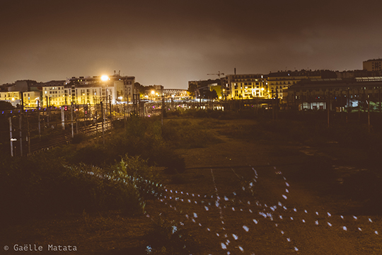 A quelques pas de la Halle Pajol, la traversée du pont Riquet offre une vue en plongée sur une mer de rails où l’on remarque la présence d’une île déserte : les vestiges de l’ancien dépôt ferroviaire de La Villette aujourd’hui disparu. Au fil de Nuit Blanche, une bande son au sein de laquelle s’entremêlent silences, éclats, et bribes, évoquera la mémoire fragmentée et évanescente du lieu. L’univers sonore s’entremêle à une partition d’apparitions lumineuses de voies ferrées fantomatiques et de formes mutantes, organiques, en résonance avec la végétation ayant envahi l’espace laissé vacant par l’activité ferroviaire. Mouvements et contours tridimensionnels s’animent alors peu à peu, suggérant que la ville se transforme…