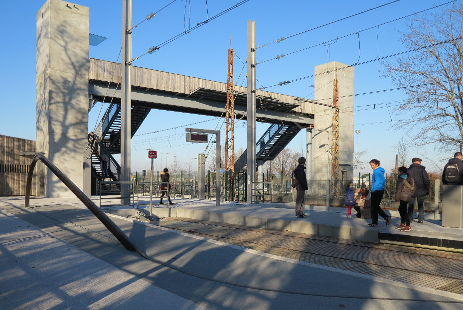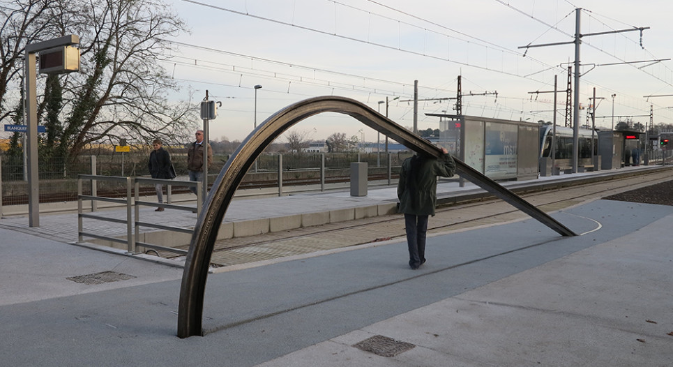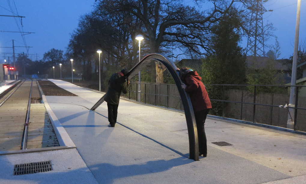 Les vibrations provoquées par la circulation des tramways se propagent dans la sculpture. L’usager/spectateur peut ainsi ressentir et écouter l’onde de l’arrivée d’un tramway par simple contact corporel. Le temps d’attente en station est transformé en un temps sensible, où chacun se projette dans le trajet effectué par le tramway grâce au lien physique créé par le rail.
