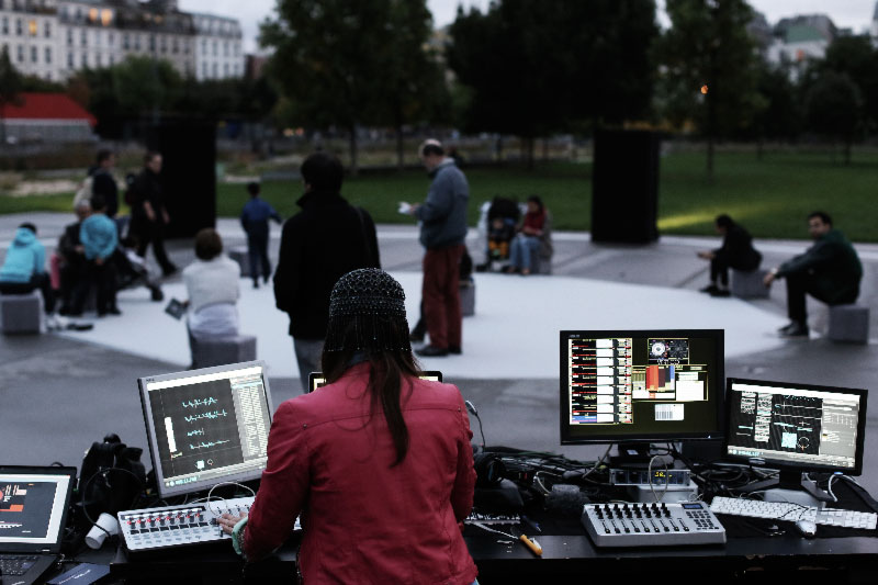 Les temporalités et les espaces se mélangent et invitent les auditeurs à pénétrer au coeur d’une aventure sonore complexe. L’écoute devient voyage onirique, rêve éveillé. Cette polyphonie presque rituelle explore la perception et la perte de repères, l’esprit des lieux et l’inconscient collectif. Les sons diffusés sur la couronne octophonique fusionnent avec l’espace acoustique local. Les auditeurs présents au cœur de l’espace peuvent avoir le regard tourné vers l’extérieur du dispositif éclairé par le halo de la couronne de néons.
