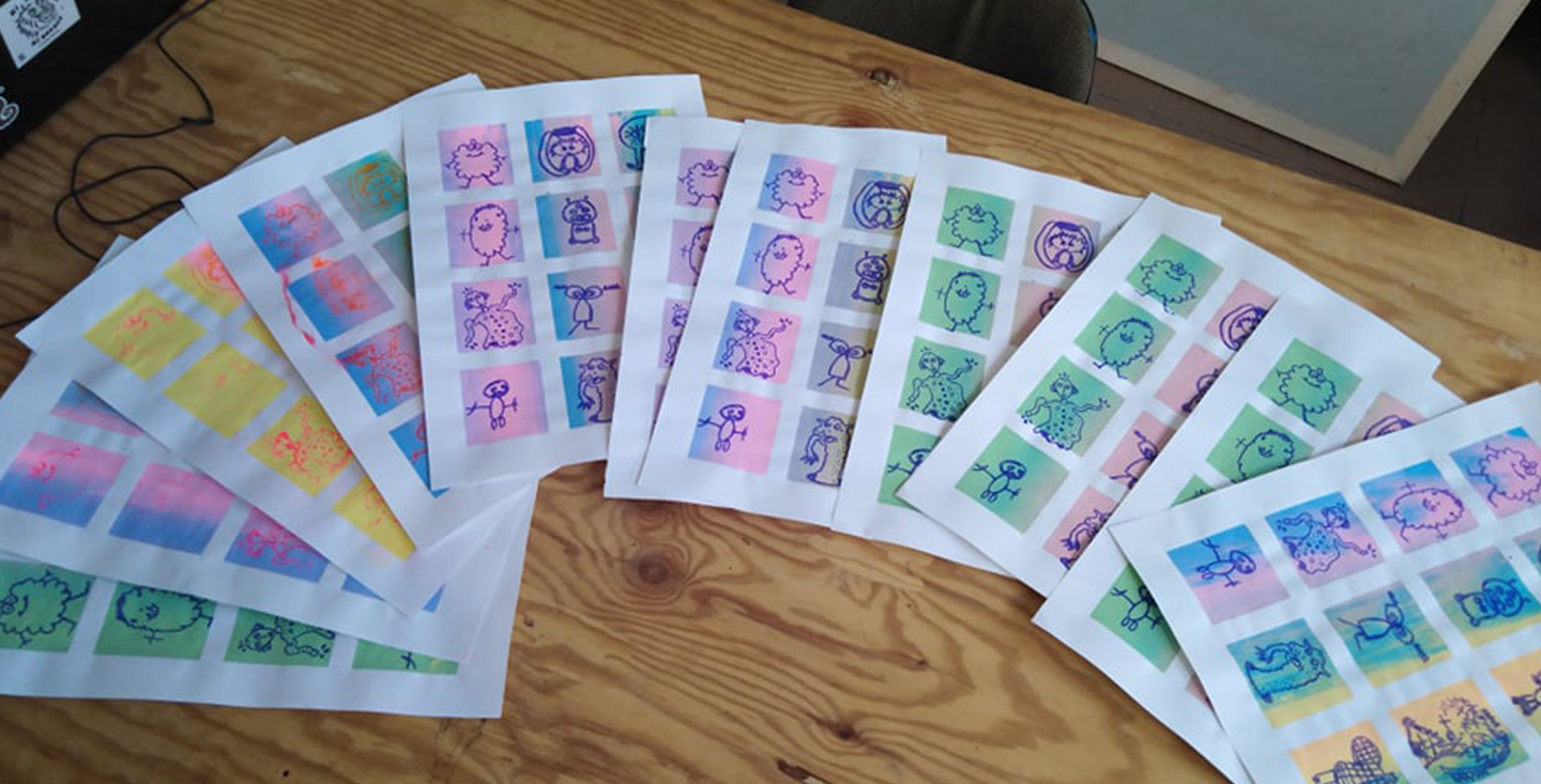 Une fois notre série de monstres prête, nous les avons placés sur les deux paysages réalisés la semaine précédente. Cela a donné lieu à de très belles compositions dans l’esprit de la parade Yokai. Pour terminer nous avons décidé d’imprimer tous les monstres sur des fonds de couleurs dégradées en sérigraphie format A3 afin de leur offrir un bestiaire. Chaque case pouvant accueillir un monstre il leur a donc été possible de découper chacune d’entre elles pour en faire des cartes à jouer dans l’esprit des cartes Pokémon à collectionner.