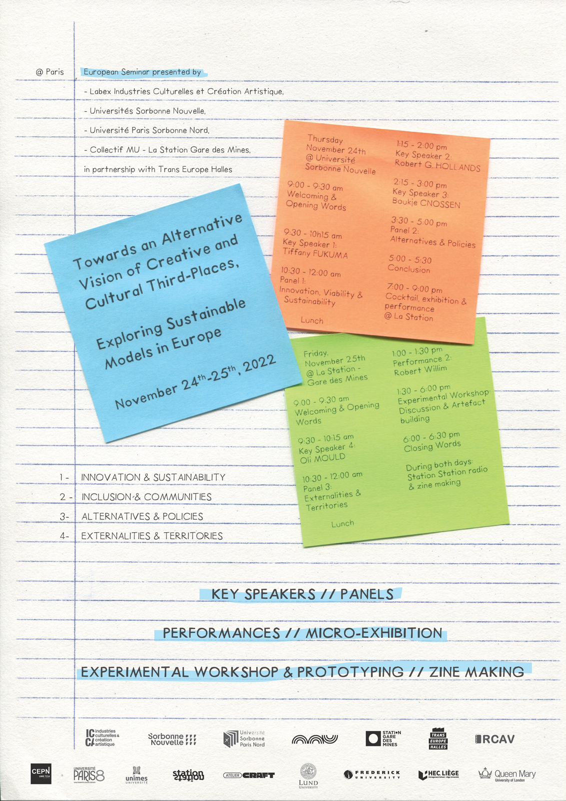 Towards an Alternative Vision of CCTPs est un séminaire conçu à l'échelle européenne portant un éclairage multidisciplinaire (artistes, chercheur·euses, aménageur·euses urbain·es, décideur·euses public·ques… ) sur les enjeux rencontrés par les « tiers-lieux culturels et créatifs » en matière de durabilité, viabilité, diversité, inclusion et externalités.