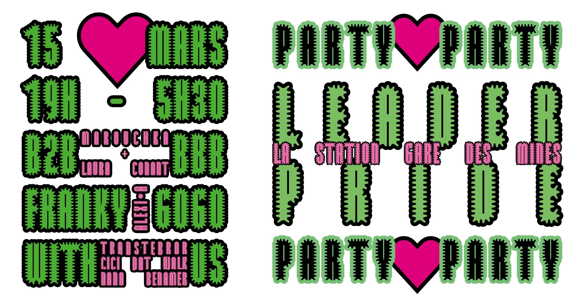 À l’issue d’une résidence croisée entre La Station — Gare des Mines et le 6B, H·Alix Sanyas présente “LEADER PRIDE” aux côtés de Bye Bye Binary, collective belgo-française de typo·graphistes détournant les outils 'straight' du design pour répandre sous licence libre de nouveaux glyphes débinarisants. La résidence a permis d’initier la création d’une fonte à haut potentiel de lisibilité comprenant deux variantes : LOVE & RAGE.
