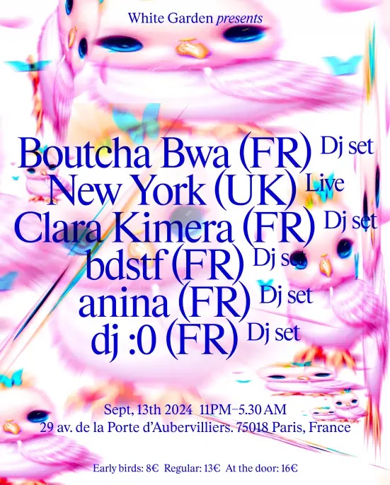 White Garden revient à la station le vendredi 13 septembre pour une soirée mi-horror mi-kawai. L’événement sera marqué par le premier live en France du duo pop anglais NEW YORK et par le set bouillant de BOUTCHA BWA, fameux duo de bouyon et shatta. La soirée sera aussi rythmée avec les sets de bdstf, dj :0, Clara Kimera, Anina et gracchus nortug.