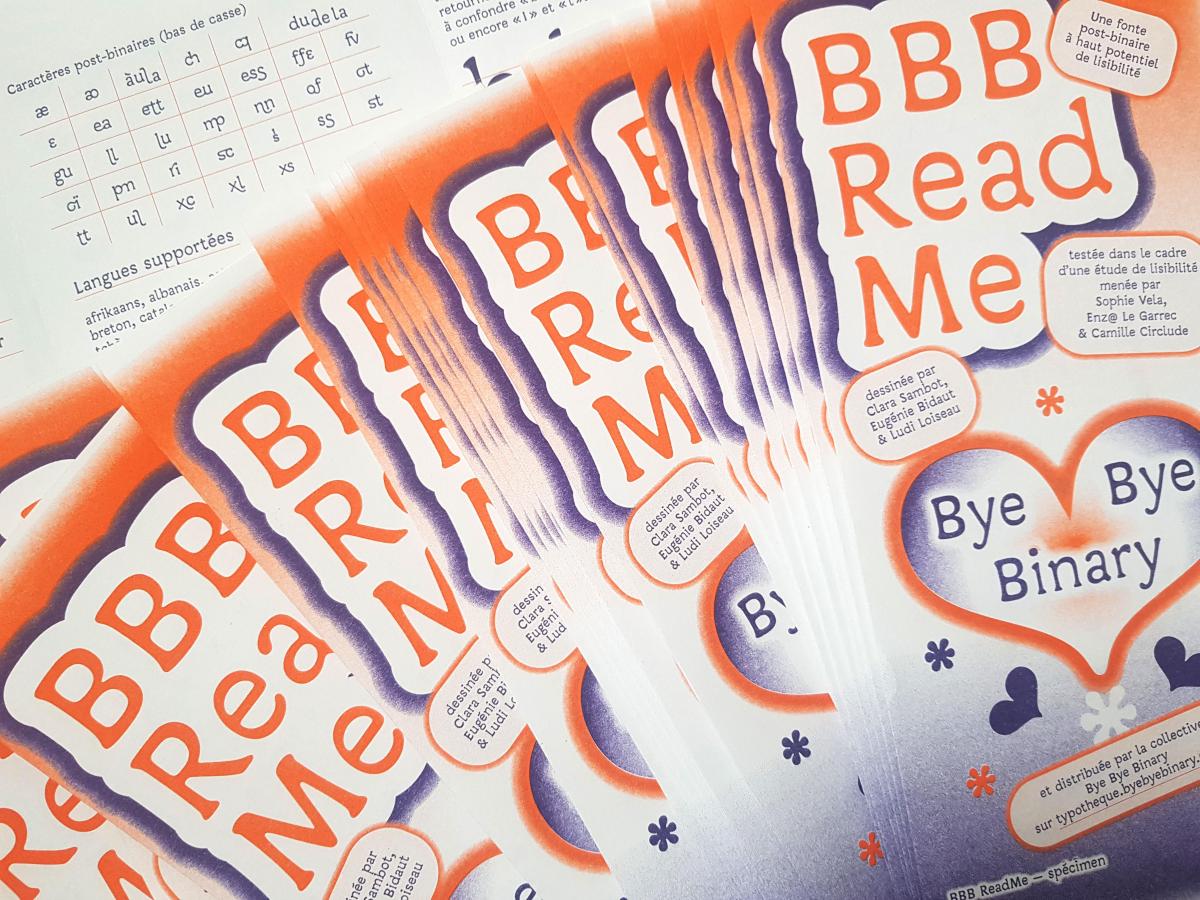 Depuis 2018, la collective Bye Bye Binary travaille à la création et à la diffusion de fontes post-binaires. Celles-ci permettent une écriture inclusive du français reposant sur un ensemble de ligatures et de caractères alternatifs dessinés pour cet usage et permettant une débinarisation graphique de la langue. La fonte BBB ReadMe a été dessinée pour tenter de répondre aux besoins spécifiques des personnes ayant un trouble cognitif impactant la lecture (troubles dys, TDA/H, TSA) en étant testée auprès des personnes concernées. L’étude s’est déroulée par le biais d’entretiens semi-directifs auprès d’un panel mixte en termes d’âge comme de genre. Ceux-ci ont permis de transmettre un ensemble de retours et recommandations aux dessinatrices de la fonte qui ont apporté les corrections nécessaires. À l'occasion de sa sortie et de sa diffusion sur la typothèque de Bye Bye Binary, H·Alix Sanyas invite sa collective à venir présenter et célébrer la fonte à La Station – Gare des Mines (Sud). La conférence sera suivie de la projection de son court-métrage JE VEUX YN PRÉSIDOL tourné à la Station (Nord) en 2023 puis d'un DJ set de Marouchka Payen.